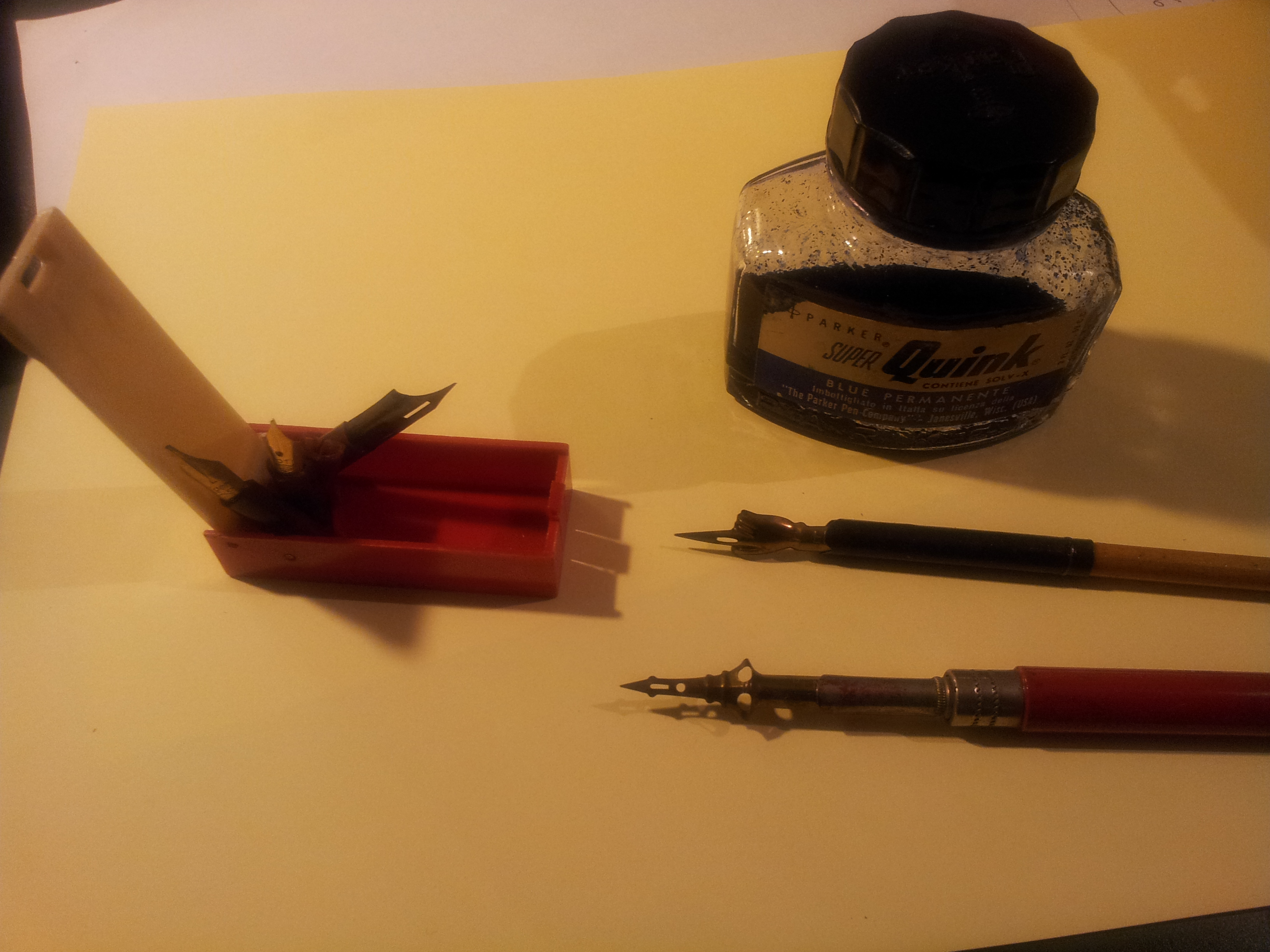 “ Vi mostro come si fa, bisogna infilare i pennini, ecco prendi questo con il ditino indice sporgente, inumidirlo con la saliva, intingere nella boccetta, non troppo, inclinare la mano così, non in verticale come con la biro, con grazia, calma, calma … non trovo più il tampone della carta assorbente, usiamo lo scottex… Aspettate, vi porto i libri sui manoscritti medioevali, così potete vedere la minuscola carolingia, vedrete che bella!”